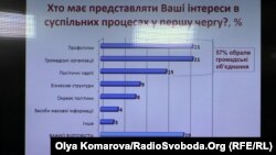Вперше до опитування включили питання про довіру до волонтерів і виявилося, що волонтерські організації отримують безперечно позитивний результат. Майже 60 відсотків українців вважають, що у суспільних процесах людей в Україні мають представляти громадські об’єднання. Такі дані озвучила Ольга Балакарієва, голова правління Українського інституту соціальних досліджень імені Олександра Яременка.