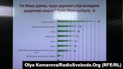 У дослідженні «Куди державі слід вкладати гроші?», безперечним лідером стала «охорона здоров’я». Цей напрямок обрали майже 50 відсотків опитаних. Далі йдуть «допомога малозабезпеченим» та «пенсії». Досить високий показник – вкладання коштів у збройні сили, цей пункт обрали 22 відсотки учасників опитування.