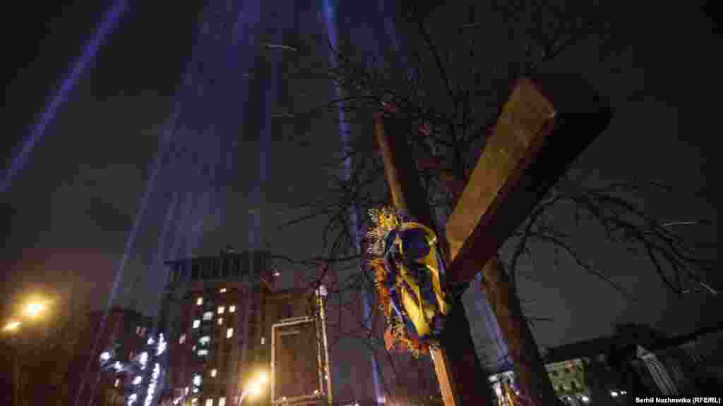 20 лютого у Києві проходить день вшанування пам’яті Героїв Небесної сотні. Сотні киян та гостей столиці прийшли до меморіалу Небесній сотні, щоб запалити свічки, покласти квіти та помолитися. Окрім цього, як і минулого року, у небі з’явилися 104 промені, які світять з тих місць, де загинули учасники Революції гідності. (Фото: Сергій Нужненко)