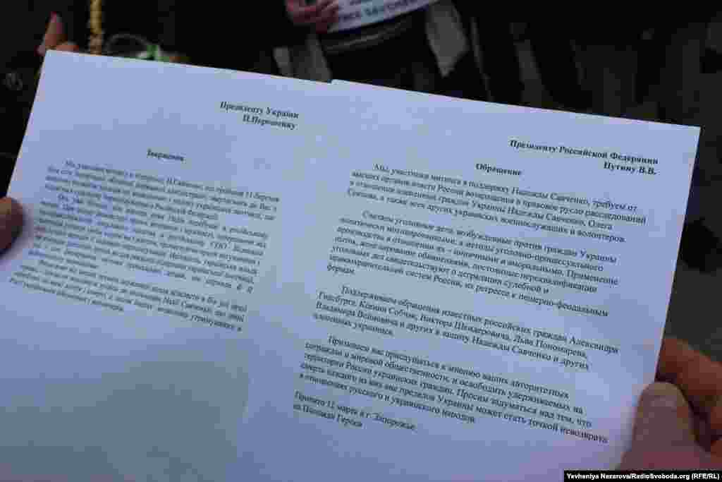 «Ми, учасники мітингу на підтримку Надії Савченко, вимагаємо від вищих органів влади Росії повернення у правове поле розслідувань щодо полонених громадян України Надії Савченко, Олега Сенцова, а також всіх інших українських військовослужбовців і волонтерів. Закликаємо вас дослухатися до думки ваших авторитетних співгромадян і світової спільноти, і звільнити утримуваних на території Росії українських громадян. Просимо вас замислитися над тим, що смерть кожного з них поза межами України може стати точкою неповернення у стосунках руського і українського народів», – йдеться у зверненні до президента Росії, ухваленому учасниками мітингу.