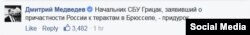 А от Медведєв демонструє свій рівень: «Начальник СБУ Грицак, що заявив про причетність Росії до терактів у Брюсселі, – придурок».