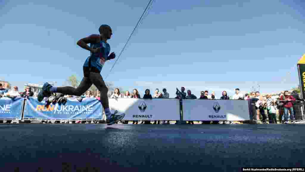Фінішує переможець напіфмарафону серед чоловіків Тарас Сало з результатом 1 година 4 хвилини 39 секунд