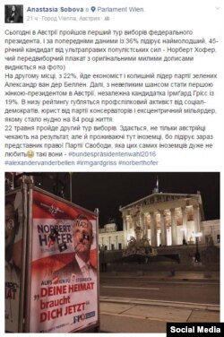 «Австрійцям, почасти, все одно – де там і з ким точиться війна. Більш того, австрійці переважно похилого віку дуже й дуже тепло ставляться до росіян, вважають що наші країни повинні дружити, а не воювати. На цьому Хофер мабуть і «виїхав», – вважає Анастасія Собова.