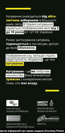 Відповідно до ратифікованих Україною міжнародних конвенцій, тортури є заборонені за будь-яких обставин. За даними міжнародної організації Amnesty international, у 2014-му катування стали найбільш поширеним порушенням прав людини у світі.