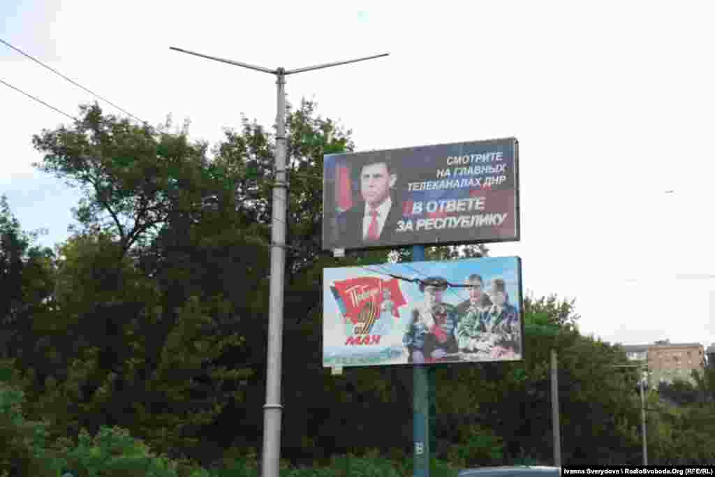 Із більшості білбордів на містян дивиться ватажок бойовиків Олександр Захарченко або його тк звані «міністри». Хоча, останнім часом реклами з Захарченком стало менше. «А то ж неможливо було їздити містом, кожні п’ять метрів – він, вже набрид усім», – зауважив у розмові з Радіо Свобода таксист Іван