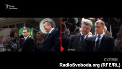 Вже у редакції, зіставивши стоп-кадри з відзнятого матеріалу з архівними фото, з’ясували: ці двоє охоронців, які тепер супроводжують президента Петра Порошенка, як дві краплі води схожі на тих, що охороняли колишнього президента-втікача Віктора Януковича.