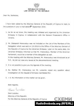 У Генеральній прокуратурі Республіки Кіпр повідомили, що зустріч Юрія Луценка з генпрокурором Кіпру Костасом Клерідісом 5 вересня організувало посольство України та Генпрокуратура України, чим заперечили слова народного депутата від БПП Олександра Грановського, що цю зустріч організував він, тому і був на ній присутній. Про це йдеться в офіційній відповіді на запит програми «Схеми», спільного проекту Радіо Свобода і телеканалу «UA:Перший», в якому журналісти просили підтвердити правдивість слів Грановського.