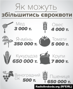 Квоти на товари, які пропонує збільшити Єврокомісія, є дуже популярними серед українського бізнесу, каже керівник Центру економічних досліджень Вероніка Мовчан. Наприклад, ЗВТ передбачає річну квоту на мед у 5 тисяч тонн. Якщо ж її збільшать іще на 3 тисячі тонн – це покращить ситуацію, хоч і не надто суттєво. Адже щорічно Україна виробляє 70 тисяч тонн меду, а експортує – 36 тисяч тонн. При цьому, варто розуміти, що квоти – досить умовне та неточне слово, каже Мовчан. Адже Україні не ставлять обмеження у тому, який обсяг товару постачати після перевищення ліміту безмитного експорту.