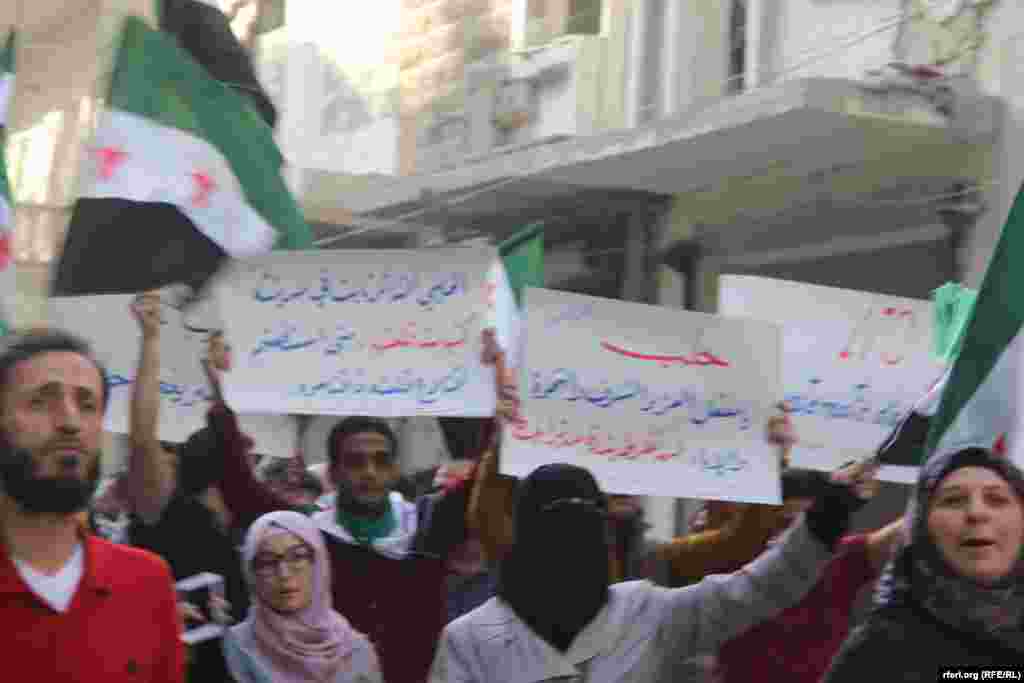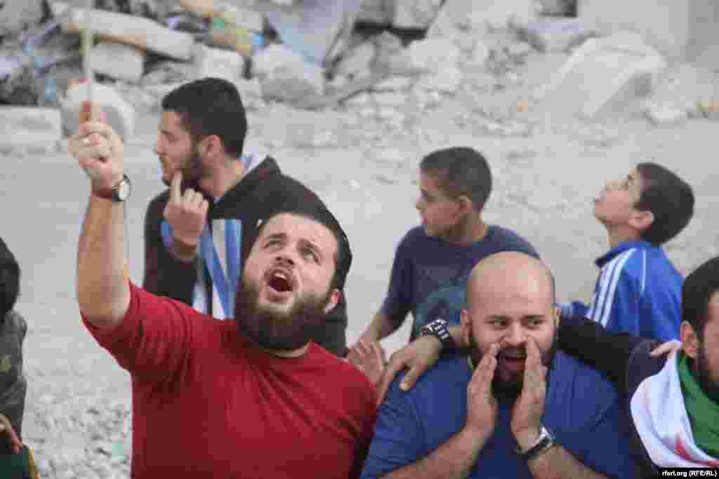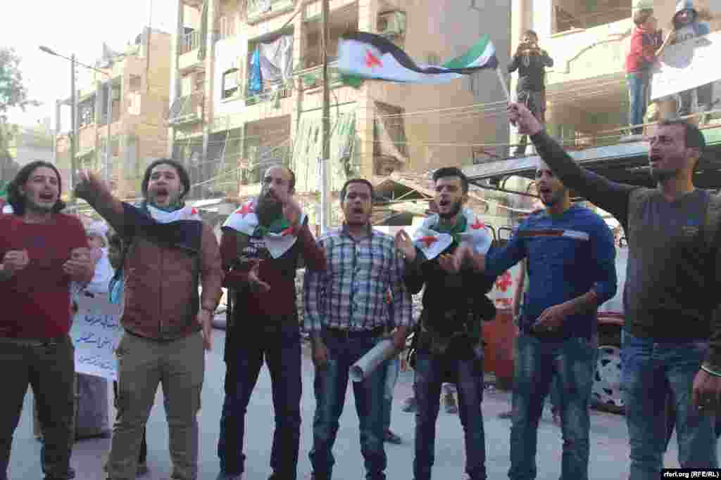 Сирійські активісти у східній частині Алеппо вийшли на знак протесту щодо атак на місто, після запеклих боїв 22 жовтня.