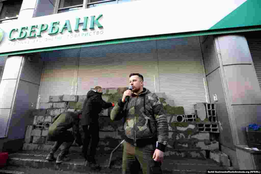 Активісти з прапорами політичної партії «Національний корпус» та «Правого сектору» пікетували головний офіс «Сбербанку» у центрі Києва. Вони замурували центральний вхід до фінустанови бетонними блоками. Минулого тижня «Сбербанк Росії» повідомив, що «готовий до обслуговування осіб, які звернулися з «паспортами» «ДНР» і «ЛНР», у всіх філіях банку». Пізніше агенція «Інтерфакс-Україна» повідомила, що дочірній банк «Сбербанку Росії» в Україні – ПАТ «Сбербанк» – не обслуговує фізичних і юридичних осіб на підставі документів, виданих на непідконтрольних українській владі територіях.