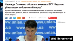 Російські ЗМІ процитували начебто заяву позафракційного народного депутата України Надії Савченко про те, що учасники АТО і патріоти уявили себе героями і цвітом нації. Однак, такого повідомлення не було на справжніх сторінках Савченко у соцмережах. Це повідомлення взяте з фейкової сторінки в «Вконтакте».