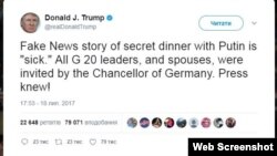 На сторінці американського президента Дональда Трампа у мережі Twitter з’явилось повідомлення щодо новин у ЗМІ про його «таємну вечерю» із російським лідером Володимиром Путіним у Гамбурзі: «Фейкові новини про «таємну вечерю» із Путіним – «хворі». Усі лідери «Групи двадцяти» і їхні дружини були запрошені канцлером Німеччини. Преса знала!».