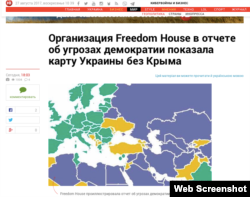 У матеріалі від Freedom House материкова Україна жовтого, а півострів Крим – синього кольору.