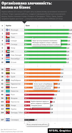 У 2017 році найменше проблем із впливом злочинності на бізнес – у Фінляндії, Норвегії та Омані, серед пострадянських країн до «щасливої» десятки входить Естонія. Найгіршою є ситуація у Сальвадорі, Гондурасі та Венесуелі. Сусідами України за «кримінальним» критерієм рейтингу є Боснія й Герцеґовина, Уганда, й Тринідад і Тобаго. Росія за цим показником випереджає Україну: в неї 86-е місце. При цьому, сильнішим, ніж в Україні, вплив криміналу на бізнес є у таких країнах-членах ЄС як Італія та Болгарія.