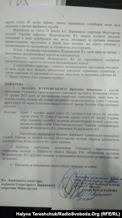 На підставі висновку дисциплінарної комісії Мін’юсту, державний секретар цієї установи підписала наказ про звільнення. 30 грудня, коли Ярослав Жукровський ще не бачив наказу про своє звільнення і – відповідно – його не підписав, приватна охорона управління юстиції не пропустила його на робоче місце. Хто саме дав таку вказівку не пропустити посадовця на робоче місце?