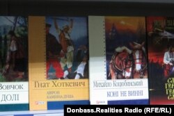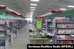 Один из книжных стеллажей в магазине выделили под остатки украиноязычной литературы. Это книги украинских авторов Василя Шкляра, Люко Дашвар, Ирены Карпы, Дары Корний и Макса Кидрука, которые выпустило и продавало в Донецке до военных действий украинское издательство «Клуб семейного досуга».