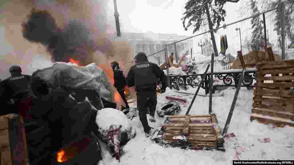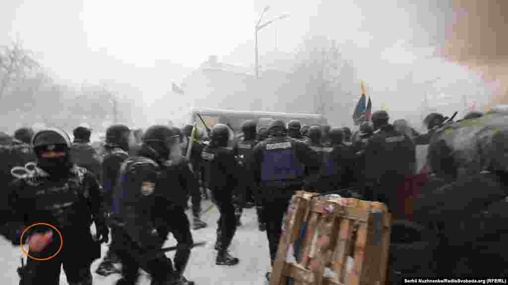 На фото поліцейський із балончиком в руках, який вибігаї із-за спини кореспондента Радіо Свобода Сергія Нужненка