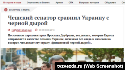 «Чеський сенатор Ярослав Доубрава назвав Україну «чорною дірою» і заявив, що не бажає відвідувати цю країну, поки там не зміниться нинішня влада. Свої думки політик озвучив в інтерв'ю чеському виданню Parlamentni Listy. На думку політика, всі гроші, які Європа відправляє в як допомогу Україні, зникають без сліду і натяків на повернення, що робить цю країну «фінансової чорною дірою», – пише «Звезда».