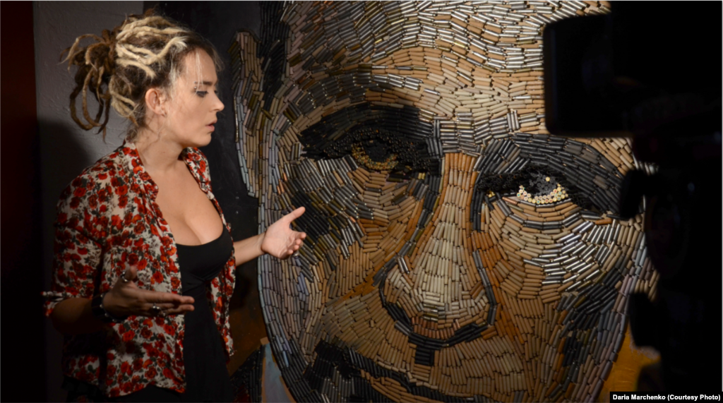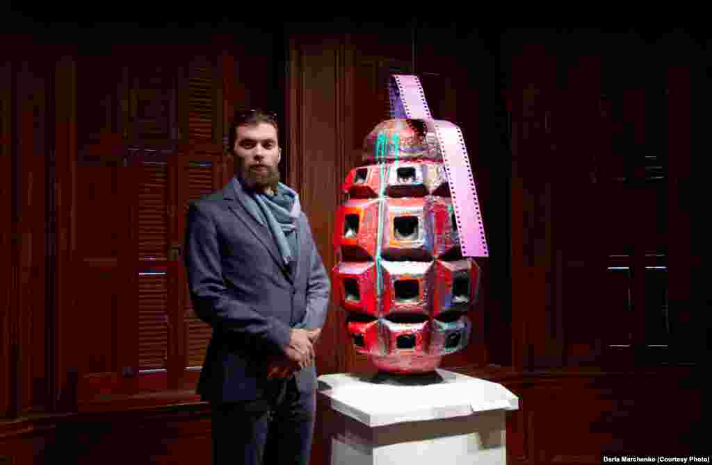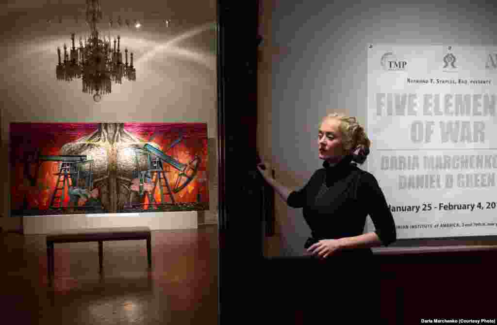 Українські художники Дарія Марченко і Даніель Грін – співавтори проекту «П’ять елементів війни» на тлі своїх арт-об’єктів. Січень, 2018 року, Нью-Йорк.