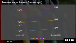 Перед так называемыми «выборами» главы группировки «ДНР» стоимость горючего в Донецке снизилась почти на 10% по сравнению с октябрем. Так, в начале ноября литр дизтоплива стоил 47 руб. (19,60 грн.). Цена 92-го бензина составляла 45 руб (18,80 грн.), 95-го – 48 руб (20 грн.), а 98-го – 52 руб. (21,70 грн.) Тогда еще «испольняющий обязанности» главы «ДНР» Денис Пушилин снизил налог на ввоз топлива до 50 долларов за тонну. Подконтрольная России администрация и в дальнейшем обещала жителям снижение цены. А некоторые донецкие экономисты в связи с этим даже прогнозировали снижение стоимости продуктов.