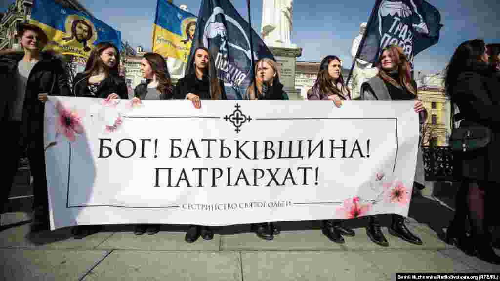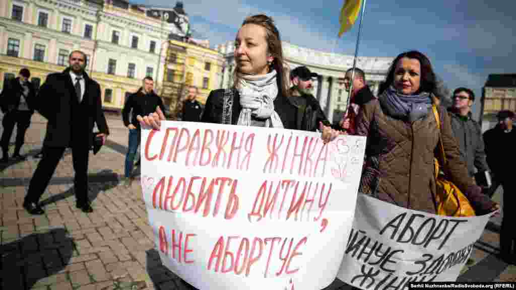 На Михайлівській площі у Києві мітингували активісти рухів консервативного спрямування, окремо з плакатами стояли пролайфери – активісти руху проти абортів. У акції брали участь і активістки антифеміністської організації «Сестринства святої Ольги».