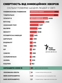 Деякі інфекційні хвороби забирають тисячі життів щодня, хоча це не стає причиною масової уваги медіа й не створює паніку по всьому світу, як це сталося з поширенням коронавірусу COVID-19 за останні три місяці. На основі даних Всесвітньої організації охорони здоров’я (ВООЗ) та досліджень Університету Джорджа Вашингтона (США) Радіо Свобода підготувало інфографіку, яка порівнює найбільш смертельні інфекційні захворювання на планеті.