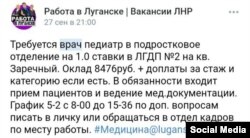 «Если вы – терапевт или педиатр, то ваш оклад начинается от 8476 рублей (3110), плюс несколько сотен рублей, если у вас есть высшая категория. Узкие специалисты получают от 7 тысяч рублей (2571), но там все зависит – какая больница и сколько у тебя пациентов. Но это если оклад, у нас же еще обязательно благодарят врача в конверте, тем более сейчас. А вакансий медицинских очень много. Сейчас постоянно ищут медсестер (5-6 тысяч рублей, 1836-2204 грн.), при том даже пишут, что готовы взять хотя бы студентов», – рассказывает луганчанка Ирина.