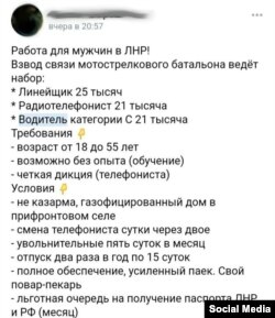 А вот по-настоящему самой денежным остается «идти воевать». В социальных сетях предлагают подписать контракт, указывая сумму от 15 тысяч (5500грн.). В других группах разъясняют – линейщик получает 25 тысяч (9183 грн.), радиотелефонист и водитель категории С – 21 тысячу (7714 грн.).