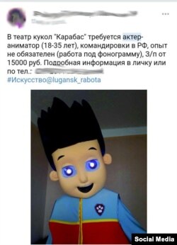 Если же вы – человек творческий, то за работу аниматором в день вам заплатят от 650 рублей (240 грн.) в Луганске, в Донецке цена начинается от 800 (300 грн.). Можно за 15 тысяч рублей (5510 грн.) играть в луганском театре кукол «Карабас». В объявлении отмечают – опыт работы необязателен, все равно выступать под фонограмму. Просто готовьтесь целый день ходить перед детьми в ростовых костюмах.
