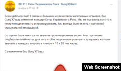 Вранці у неділю 15 листопада 2020 року на Вк-сторінці події «Хиты украинского рока», що мала відбутися у легендарному Донецькому клубі «Gung'Ю'бazz», з’явилося повідомлення про скасування цього заходу. Як пояснили організатори, відбулося це «у зв’язку з великою кількістю негативних відгуків». Цікаво, що не меншу кількість негативних відгуків викликало і саме повідомлення про скасування концерту.