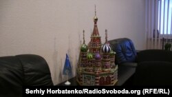 Первый пункт назначения – офисное здание. Ветераны говорят, что тут расположен офис Олега Берко и заодно собираются на совещания члены партии ОПЗЖ. Внутри, кроме сторожа, никого нет. Всеобщее внимание привлекает макет храма Василия Блаженного (расположен в Москве на Красной площади). Рядом с макетом стоит флажок ОПЗЖ.