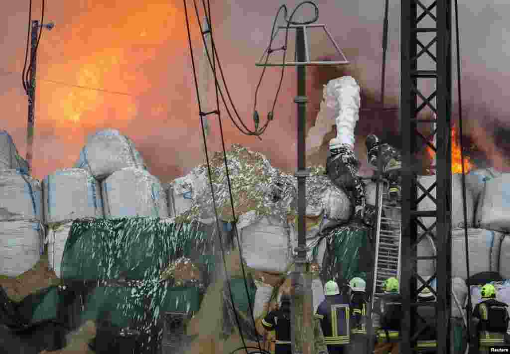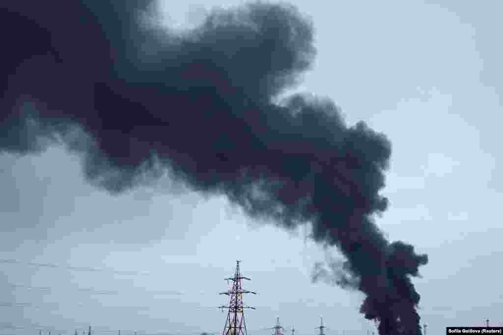 Дим здіймається в небі над високовольтною лінією електропередач на місці удару російської ракети за межами Харкова, 22 березня 2024 року