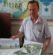 Заступник муфтія мусульман Криму Джеміль Бебішев демонструє план Сімферопольської соборної мечеть, землю під яку влада ще не дала