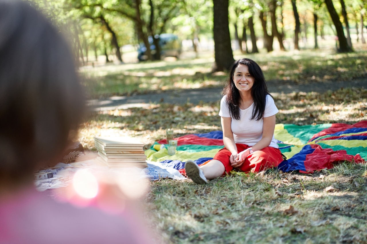 Поки говоримо з Людмилою, пледи та приладдя для малювання разом з малюками розкладає усміхнена жінка. Вона одягнена у яскраво червону довгу спідницю: поправляє неслухняні пасма волосся і говорить з дітьми, наче з дорослими. Чітко, без зменшено-лагідних слів – прохання, контакт, все злагоджено і водночас по-дружньому тепло.