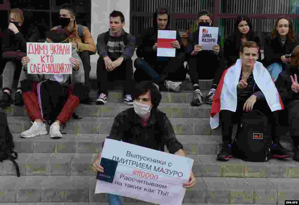 Студент тримає табличку, на якій написано: «Ми – Діма Мазуро». 16 вересня Мазуро у розмові із викладачем гнівно сказав, що «інших проблем для людей немає», маючи на увазі незгоду людей із оголошеними результатами президентських виборів, які вважаються сфальсифікованими. 25 вересня влада наказала затримати Мазуро на 23 дні