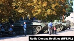 «Военные» порадовали детвору, пригнав с передовой два танка и БТР. Боевики демонстрировали танки и даже рассказывали, как они стреляют (хотя многие дети Донбасса наверняка и так видели их в действии).