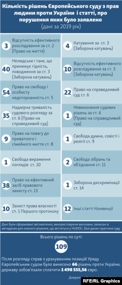 По 109 справах суд виніс рішення по суті, в 66 з них Україну визнав винною у порушенні прав людини і зобов’язав виплатити заявникам майже 1,5 млн. євро компенсації.