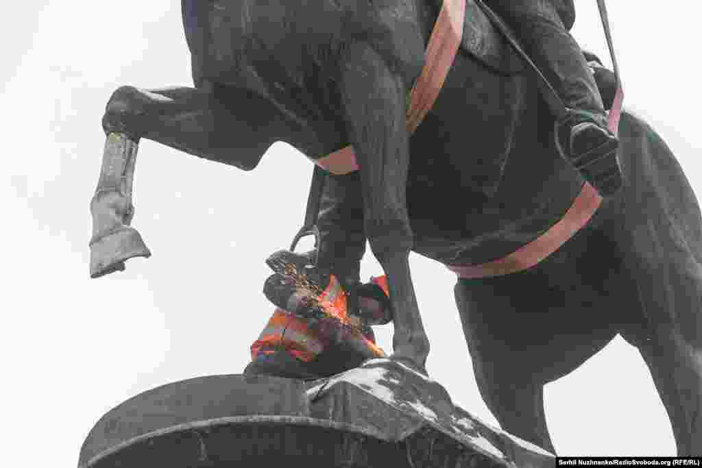 Комунальники прибирають мотузки з пам'ятника після демонтажу