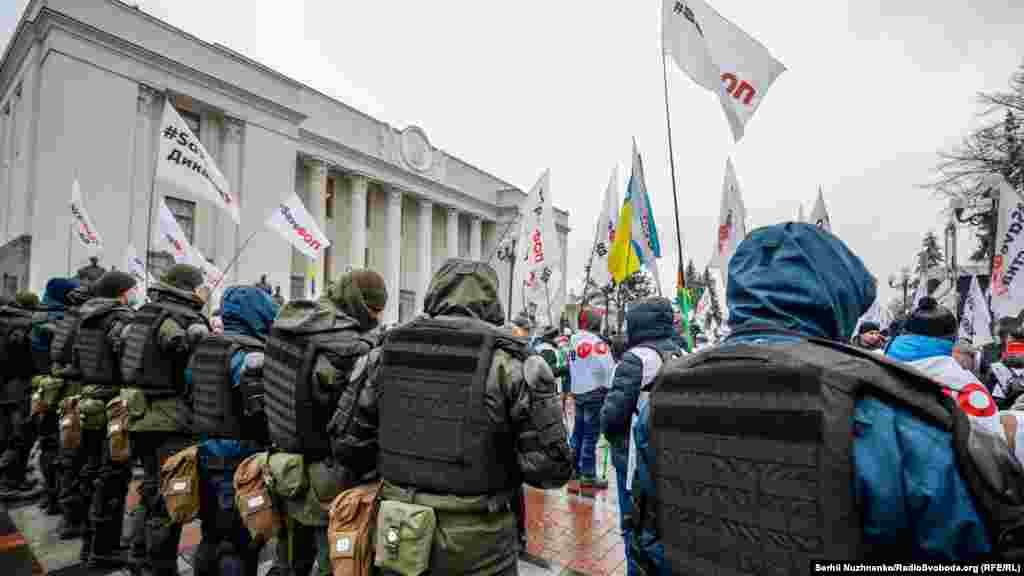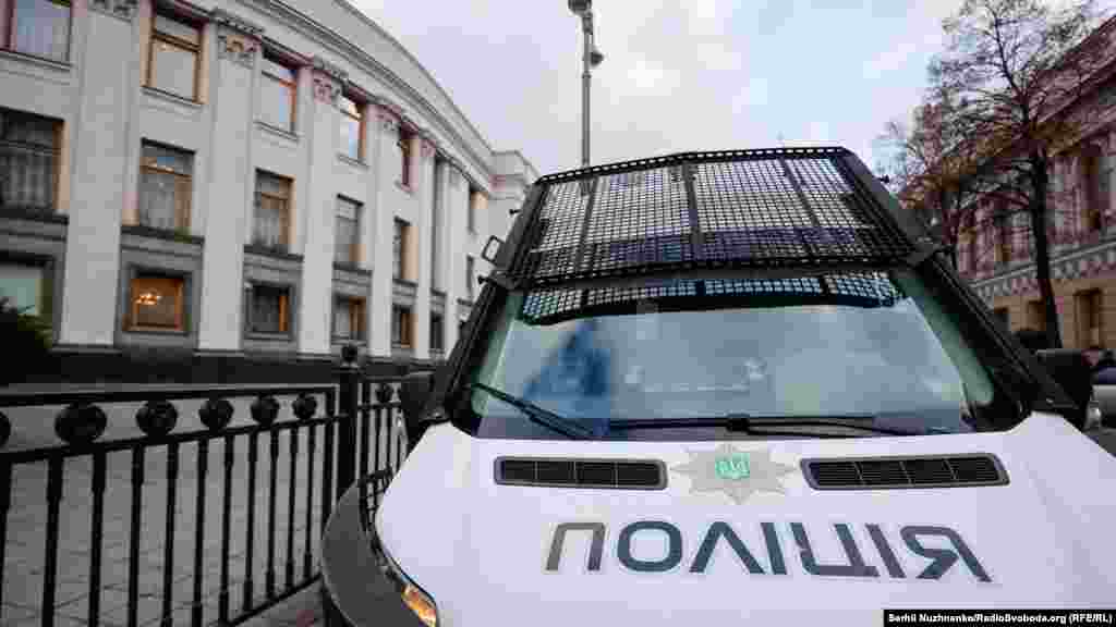 Через анонсовані масові заходи та виступ президента України Володимира Зеленського у Верховній Раді в урядовому кварталі зранку посилили охорону вулиць, місцями також обмежили рух транспорту.
