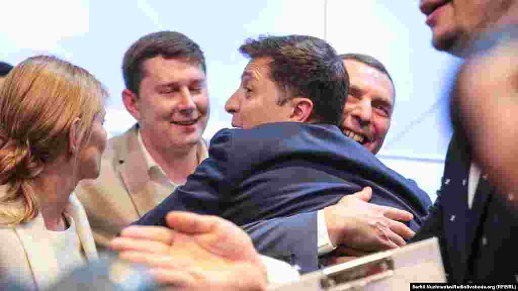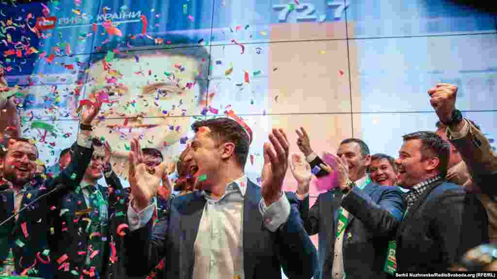 За результатами Національного екзит-полу, лідера перегонів Володимира Зеленського підтримали рівно 73% виборців, чинного президента Петра Порошенка – 25,5% учасників голосування. У результатах, оприлюднених одразу після закриття виборчих дільниць, Зеленський мав на 0,2% підтримки більше, Порошенко – настільки ж менше. Що відбувалося у штабі Зеленського - в фоторепортажі Радіо Свобода.