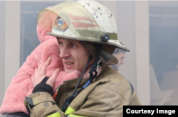 На фотографії ДСНС Волобуєв несе на руках дівчинку на ім’я Олександра.
