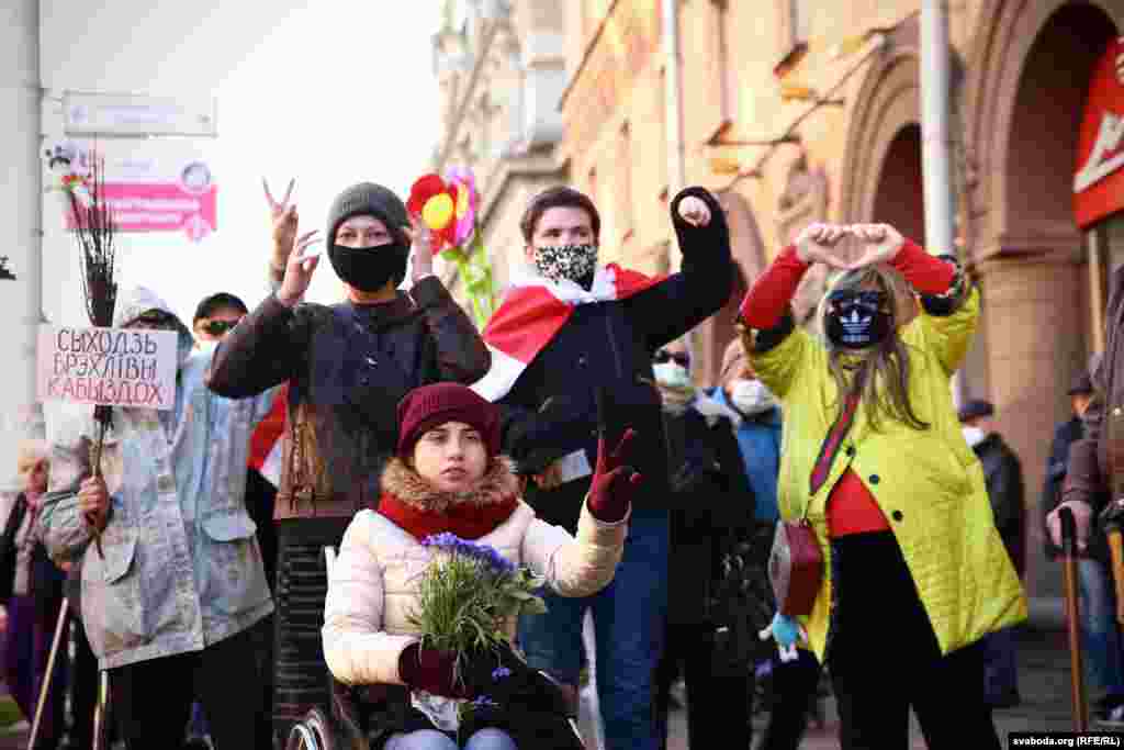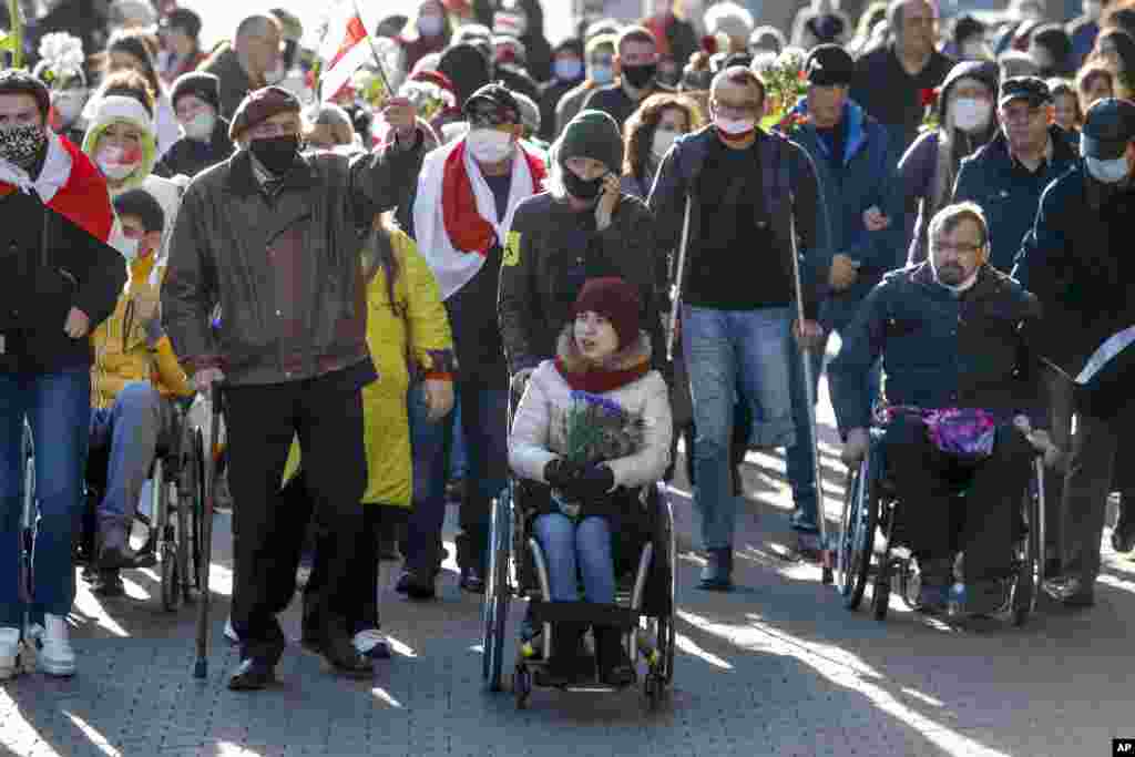 Білоруси з інвалідністю несли квіти і заборонені біло-червоно-білі прапори опозиції, коли мирно проходили вулицями Мінська 22 жовтня під час опозиційного заходу під назвою «Марш людей з нескінченними можливостями».