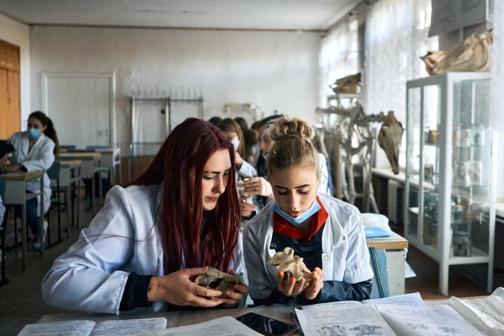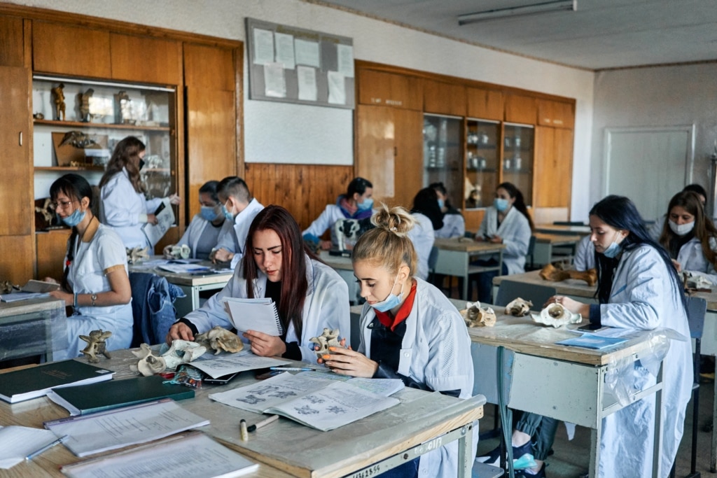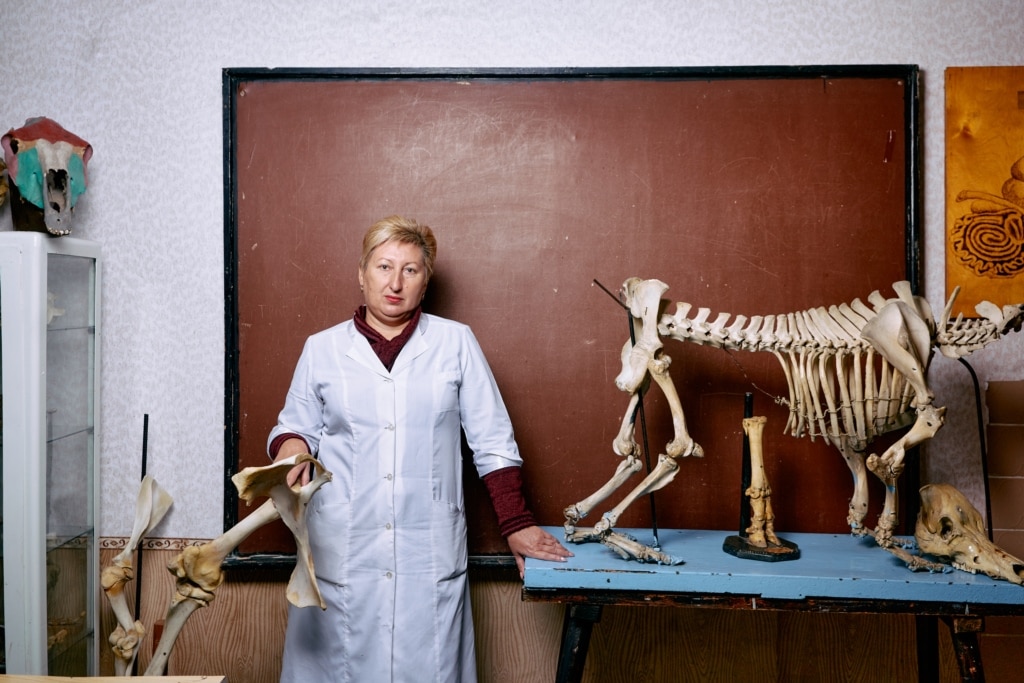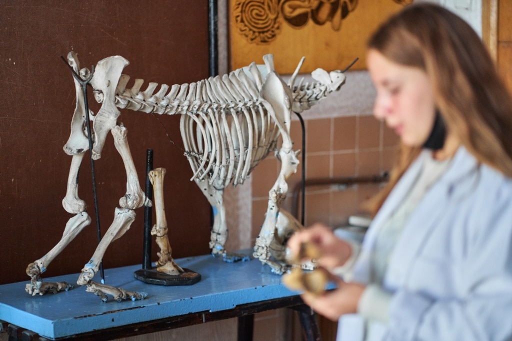 У напівзаповненій аудиторії номер 62 кілька десятків студентів-ветеринарів досліджують анатомію тварин. На скляних стелажах розташовані забальзамовані останки: кістки зап’ястя коней, черепи свиней, скелети рогатої худоби. Все це – навчальні предмети для студентів. Кожен бере по черзі кістку, крутить у руках, щось звіряє із підручником та тихо бубнить під ніс. Пізніше вони по черзі підходять до викладача і відповідають засвоєний матеріал.