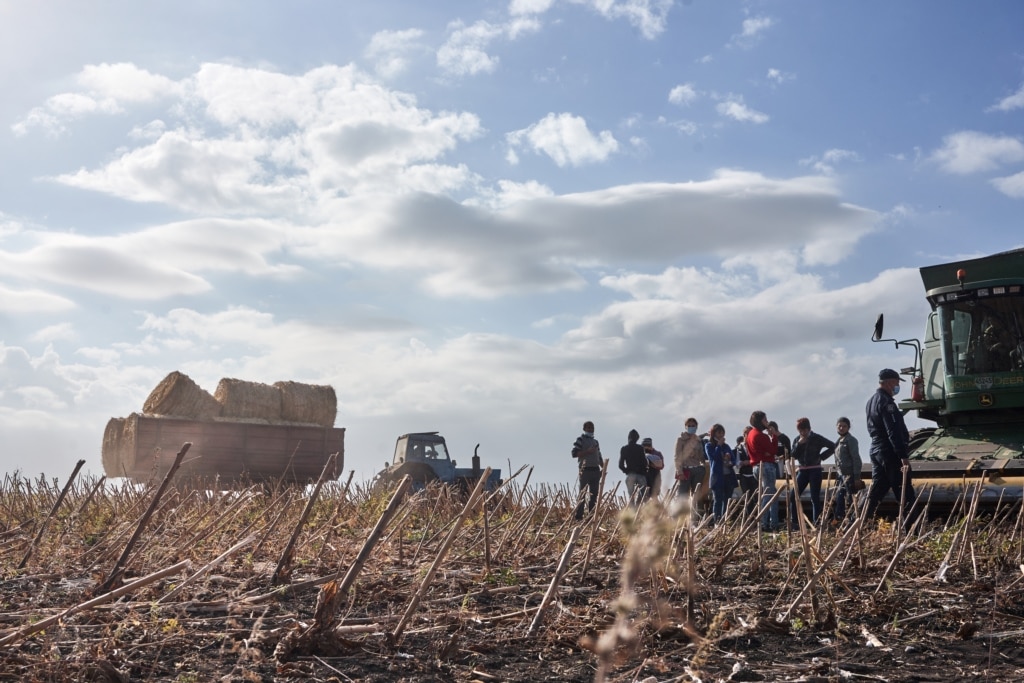 Наступного ранку там ми побачили сцену, варту істерну Сергія Жадана «Ворошиловград»: посеред поля з неприбраним соняшником застиг комбайн, біля якого кучкувались із десяток поліцейських. Поважного віку дагестанець гаряче про щось сперечався з одним із них. В кабіні комбайну нудьгували двоє машиністів, а за всім цим, крім нас, із цікавістю спостерігали з десяток жителів сіл поблизу, які лузгали насіння прямо з соняхів.