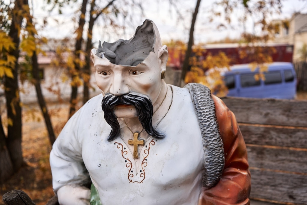 Наступного дня ми зустрілися, щоби сфотографувати Богдана у його улюбленому місці – єдиному визначному місці селища (окрім, звичайно, вулиці Дружби народів) – великому спорожнілому парку із вражаючим за розміром монументом «Україна – визволителям». «Таке ж є на заході України – у Львові чи Ужгороді, я не знаю. На честь того, що остаточно вибили фашистів», – пояснює нам Богдан. Саме звідси 77 років тому почалося звільнення УРСР від нацистських військ. Повертаючись до готелю, довго обговорюємо наше відчуття, що тут 2014-го для України знову почалася – або, принаймні, найбільш яскраво проявилася – нова епоха. Питання тільки – яка?