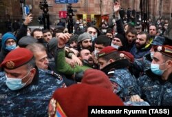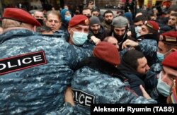 Тим часом в Єревані біля будівлі уряду Вірменії, де демонстранти проводять акцію протесту з вимогою відставки прем’єр-міністра Нікола Пашиняна, почалися сутички з поліцією. Є повідомлення про затриманих.
