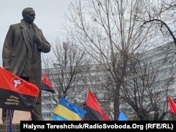 Учасники акції заспівали гімн, а також пісню «Батько наш Бандера, Україна – мати».