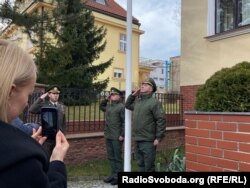 Після його промови перед посольством підняли бойовий прапор, який установі подарували бійці з передової та заспівали гімн України.