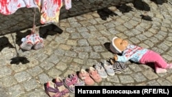 До посольства України у Варшаві мітингарі принесли закривавлений дитячий одяг і взуття як символ вбивств, які відбулися на Волині.