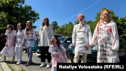 «Тут зібралися жінки, у яких рідні та друзі на війні. Ми мусимо хоч щось зробити, поки ми є за кордоном, щоб голос наш не був забутий в Європі, в цивілізованому світі. Ми вже третій рік поспіль наголошуємо, що наявність представників країни-терориста в цивілізованому світі, зокрема, в Польщі – це профанація. Ми не розуміємо, чому вони досі тут є», – сказала Радіо Свобода співорганізаторка акції протесту Емма Загинайко.